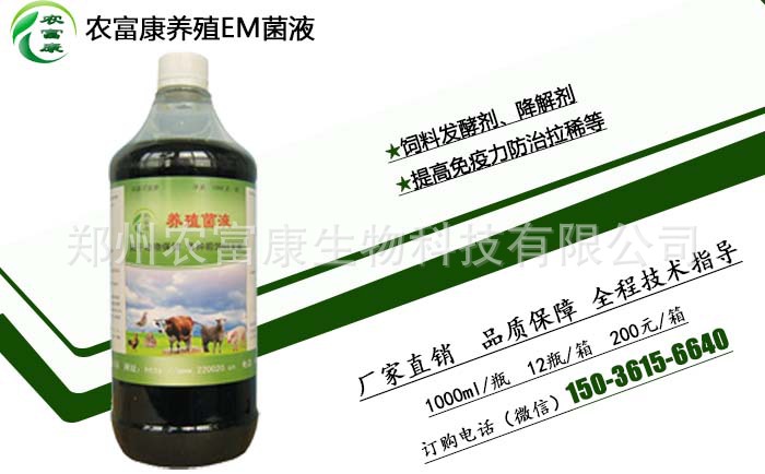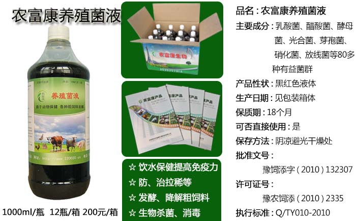 规格:农富康养殖菌液(酒糟饲料发酵剂)1000ml(1公斤)/瓶,12瓶/箱,200元/箱