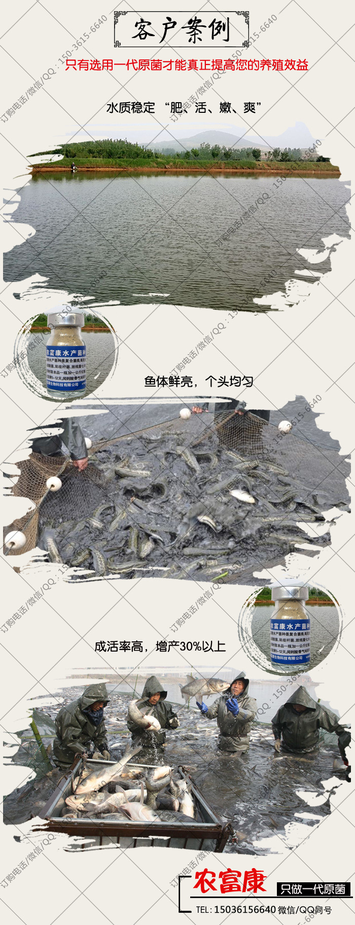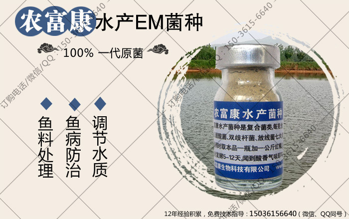 河南农富康生物科技有限公司2005年成立,投资300万致力于益生菌(EM菌)的研制与生产,农富康养鱼水产EM菌种是一代原菌由六大类,80多种益生菌复合而成,菌种含菌量每克不低于500亿个,使用前需要自己简单培育。本着与客户互利共赢,做良心企业的原则,农富康水产EM菌种每瓶售价仅35元,客户使用成本低效果好,公司经营12年来,已累计客户18万余。 (农富康养鱼水产EM菌种订-货方式:张经理150-3615-6640)